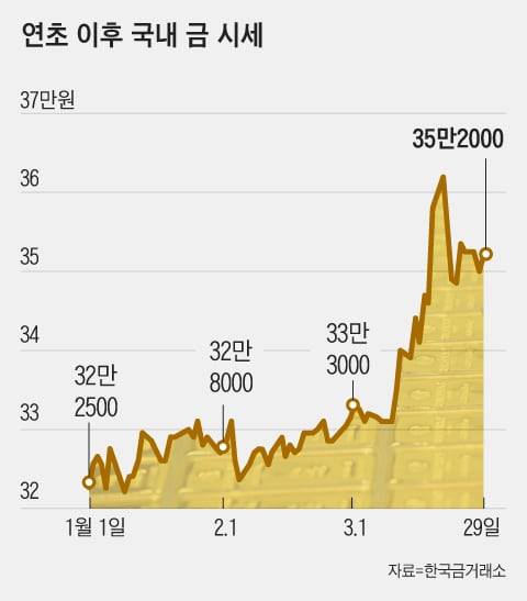 29일 한국금거래소에 따르면, 지난 20일 순금 한 돈(3.75g) 가격은 36만2000원을 기록해 사상 최고치를 기록했다. 작년 말에 비하면 13% 가량 올랐다. 서울 종로3가 귀금속타운에선 ‘조만간 40만원을 뚫을 것’이란 예상도 나온다. 29일 현재는 순금 한 돈 가격은 35만2000원(살 때 기준) 정도다. 한 돈 짜리 돌반지 선물을 하기엔 부담스러운 금액이 됐다.