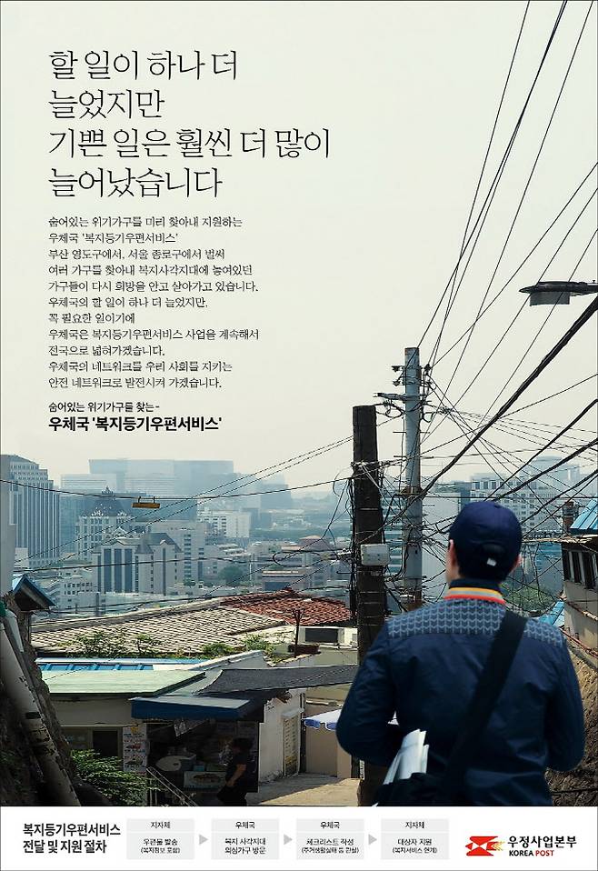 부산시 영도구 주민 A씨는 ‘복지등기우편서비스’를 통해 기초생활수급대상자에 선정될 수 있었다. 집배원 B씨가 평소 그에게 독촉장과 고지서 등이 자주 발송되는 것을 체크리스트에 기재해 지자체에 전달했다.