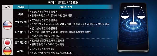 미국에서는 아보, 로켓로이어 등 수백 개의 법률 플랫폼이 등장, 변호사와 의뢰인 연결 및 소통을 활발하게 지원하고 있다. 일본에서는 대표적인 법률 플랫폼 '벤고시닷컴'이 2014년에 상장, 일본 변호사 가운데 50% 이상이 회원으로 활동하고 있다. 독일에서는 ARAG가 '리걸 파이낸싱' 분야에서 주목할 만한 성과를 내고 있다. 리걸 파이낸싱은 경제적인 이유로 소송을 포기하는 국민에게 대출, 보험 등을 통해 변호사 선임 및 소송 비용을 지원하는 '금융 상품'을 말한다. 정부·의회·법원의 정책이나 법 및 판례 규제 정보 등을 AI와 빅데이터 기술로 수집·분석해서 신규 법안의 입법 확률을 예측하는 서비스도 있다. 한국계 미국인이 창업해 지난해 나스닥에 상장하며 화제가 된 피스컬노트가 대표적이다.