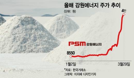 29일 강원에너지는 전 거래일 보다 900원(2.3%) 오른 4만원으로 거래를 마쳤다. 지난달 말(2월28일, 9630원)보다 약 4배 이상 뛴 것. 이번달에만 개인과 외국인 투자자들은 강원에너지 주식을 각각 38억9100만원, 36억3300만원 어치 순매수했다.
