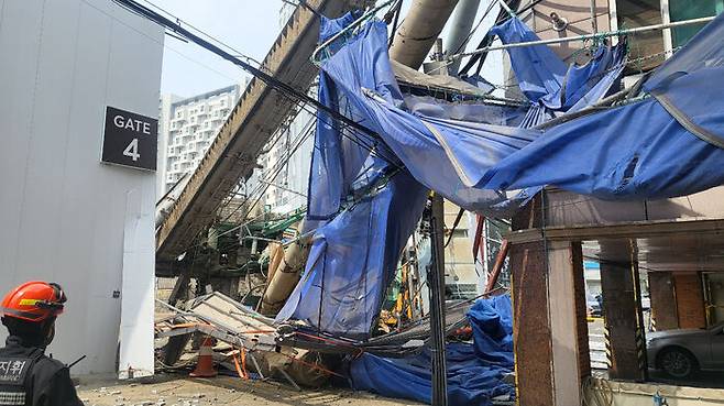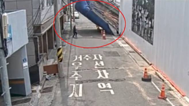 당시 장면이 찍힌 CCTV 영상 등에는 인근을 지나던 행인이 부서지는 펜스를 보고 빠르게 발길을 돌리는 아찔한 모습이 담기기도 했으며, 이 사고로 인해 건물의 옥상과 상층부 등이 훼손된 것으로 파악됐습니다.