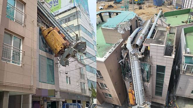 [포착] 37m 중장비 넘어지며 인근 건물 덮쳐…"임신부 등 5명 이송"