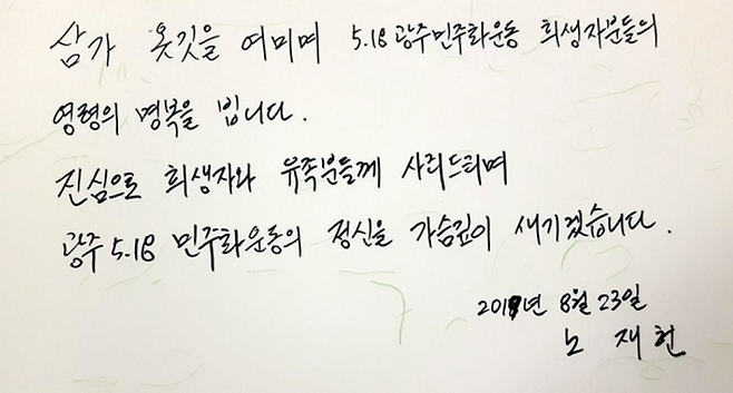 노 씨는 5·18 '민주의 문' 방명록에 '진심으로 희생자와 유족분들께 사죄드리며 광주 5·18민주화운동의 정신을 가슴 깊이 새기겠습니다'는 글을 남기기도 했습니다.