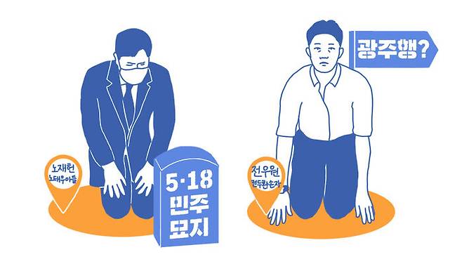 5·18 민주화운동 강제 진압의 책임이 있는 전두환·노태우 씨는 세상을 떠날 때까지 사과하지 않았습니다. 가족 중에서는 유일하게 노태우 씨 아들 재헌 씨가 4년째 아버지를 대신해 5·18 민주화운동 유가족 등에게 사과와 참회의 모습을 보이고 있는데요, 전두환 씨 손자 우원 씨도 노재헌 씨 길을 갈 수 있을까요?
