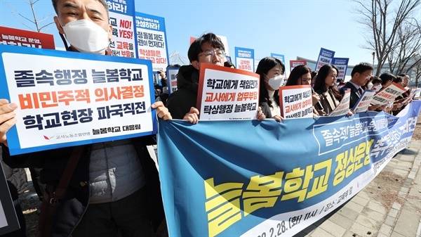 특히 기존 초등학교 돌봄교실 운영의 주축 인력인 돌봄전담사들이 포함된 학교비정규직노조는 현재 인력 체계와 저임금 구조하에서 준비없이 졸속으로 추진되는 늘봄학교를 운영할 수 없다며 오는 3월 31일부터 총파업에 돌입하기로 한 상태다.