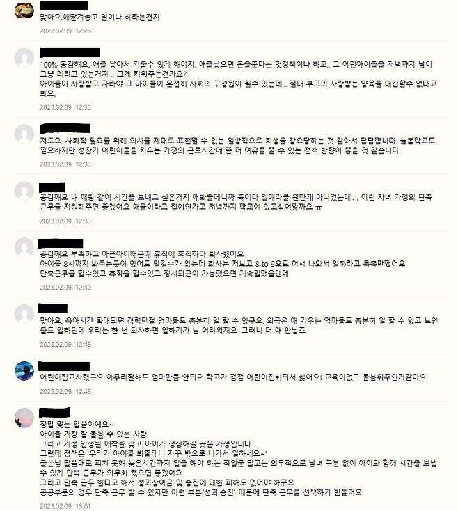 육아 관련 커뮤니티에서도 늘봄학교에 대한 긍정적인 여론은 찾아보기 어렵다. 부모들의 노동 시간을 줄여 가정의 돌봄이 가능해지도록 하는 것이 상식적이지 초등학교 저학년을 학교에서 밤늦게까지 돌봐주는 정책에는 공감하기 어렵다는 의견이 대부분이다.