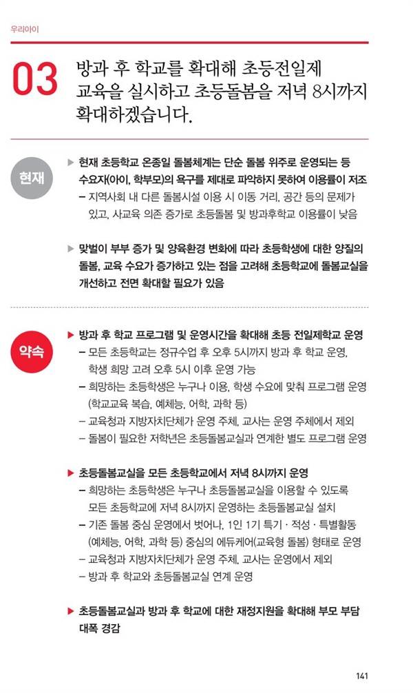 | ▲ 윤석열 대통령 후보 시절 '초등 전일제 학교' 공약 현재 '늘봄학교'에 해당하는 '초등 전일제 학교' 공약은 국민의힘 제20대 대통령 선거 정책공약집 141 페이지에 수록되었다. |
