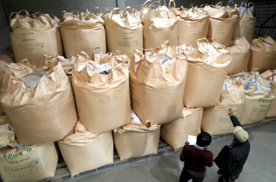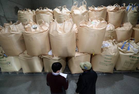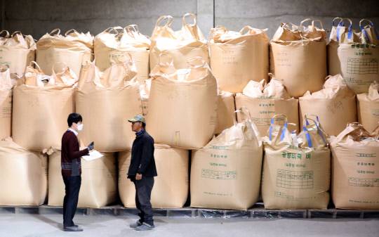 국민의힘과 정부가 국회 본회의를 통과한 양곡관리법 개정안과 관련해 29일 윤석열 대통령의 거부권 행사를 공식 건의했다. 이날 대전 중구 서대전농협창고에서 관계자가 수매 후 보관 중인 쌀을 살펴보고 있다.