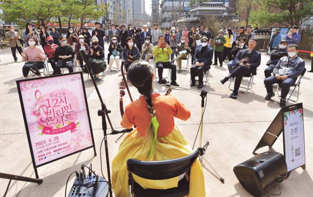 시민들이 29일 서울 강남구 선정릉 정문 앞에서 해금 연주를 감상하고 있다. 삼성2동주민센터는 매달 마지막주 수요일 점심시간에 '12시 비타민 콘서트'를 연다.