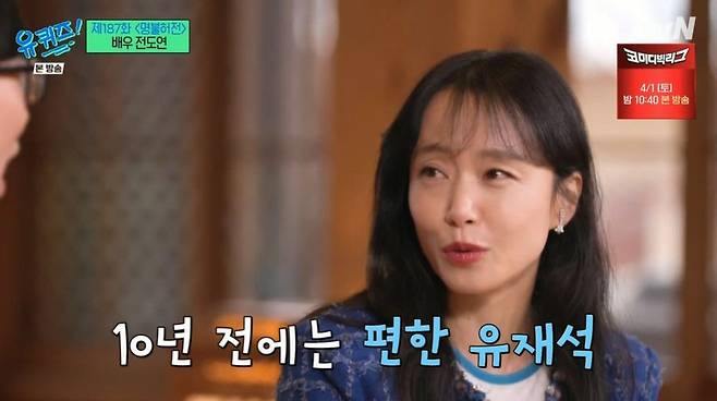 전도연은 ‘칸의 여왕’으로 불리는 대한민국 대표 연기파 배우다. 유재석과 서울예대 91학번 동기이기도 한 그는 “예나 지금이나 성격이 까칠하다”는 유재석의 짓궂은 농담에 “나를 잘 아시나?”라며 너스레를 떨었다.
