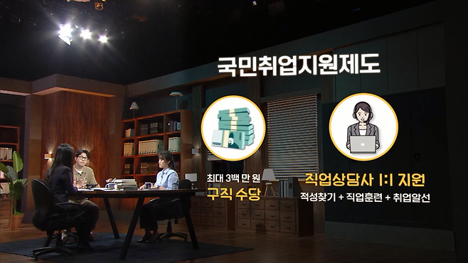 청년을 포함해서 저소득 구직자에게 최대 300만 원까지 구직 수당을 지원하고요. 수당뿐만이 아니라 직업 상담사가 구직자를 1:1로 관리하면서 적성 찾기부터 직업 훈련, 취업 알선까지 돕는 종합적인 취업지원제도입니다.