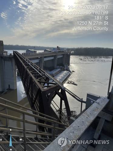 In this photo provided by Kentucky Energy and Environment Cabinet, two barges are stuck against the dam just south of downtown Louisville, Ky., on Tuesday, March 28, 2023. Crews were working Wednesday to remove three remaining barges that got loose on the Ohio River, including one carrying methanol. (Kentucky Energy and Environment Cabinet via AP) AP PROVIDES ACCESS TO THIS PUBLICLY DISTRIBUTED HANDOUT PHOTO PROVIDED BY KENTUCKY ENERGY AND ENVIRONMENT CABINET MANDATORY CREDIT.
