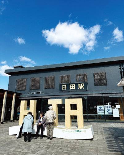 히타역과 히타 버스터미널은 서로 마주 보는 자리에 위치해 있다. 어디서 내리든 히타역 앞 랜드마크에서 사진을 찍어보자. HITA 중 알파벳 'I’ 자리에 내가 들어가면 완성! 삼나무가 특산물인 히타답게 랜드마크와 역 대합실 모두 삼나무로 돼 있다.