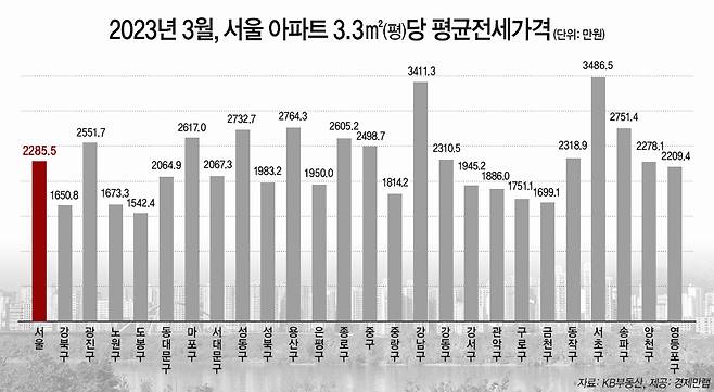 30일 부동산 정보제공 업체 경제만랩이 KB부동산의 주택가격동향을 살펴본 결과, 올해 3월 서울 3.3㎡당 아파트 평균전세가격은 2285.5만원으로 지난 1월(2398.3만원)과 비교하면 112.7만원 떨어졌고 4.7% 하락했다.