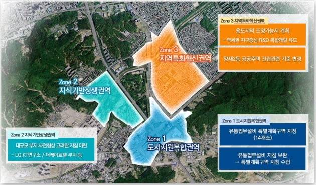 이번 지구단위계획을 통해 유통 업무 설비(13개소) 특별계획구역 지정을 통해 도시계획시설 해제를 허용하기로 했다. 교통개선 기반시설 등으로 공공기여(20%)를 하는 조건이다. 양재동 파이시티(옛 화물터미널) 부지 9만4949㎡를 4525억원에 매입해 복합개발을 추진중인 하림 그룹 등 대규모 민간 사업을 활성화하겠다는 취지로 해석된다. R&D 시설 비중 역시 기존 50%에서 40%로 낮춰주기로 했다.