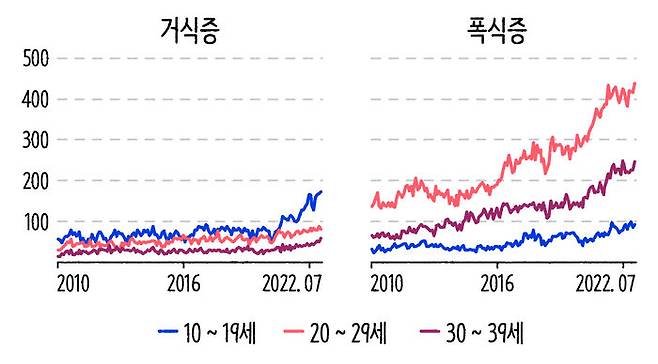 "늘어나는 폭식증 환자를 우선적으로 관리해야겠구만…" 하는 생각이 들 수 있지만 연령별로 살펴보면 상황이 조금 다르다는 게 보일 겁니다. 거식증과 폭식증을 두고 10대부터 30대까지 월별 환자 변화를 그려본건데 연령대별로 흐름이 좀 다르죠? 거식증을 살펴보면 10대 환자의 급증세가 상당하다는 걸 확인할 수 있어요. 거식증에선 예전부터 10대가 20대, 30대보다 환자수가 많긴 했지만 2020년 하반기부터는 그 격차가 심해지고 있죠.