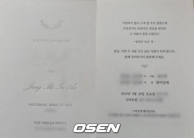 청첩장에는 양귀자의 장편소설 '모순' 중 글귀 일부가 적혀 시선을 사로잡았다. "사랑하지 않고 스쳐 갈 수도 있었는데, 사랑일지도 모른다고 걸음을 멈춰준 그 사람이 정녕 고맙다고"라며 서로를 향한 애틋한 마음을 느끼게 했다. 이어 "봄날, 저희 두 사람 크고 깊은 사랑이 되려 합니다. 함께 자리하시어 축복해 주세요"라고 덧붙였다.