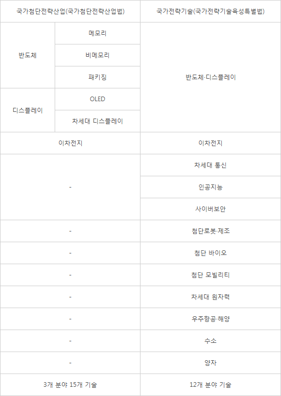 국가전략기술육성특별법과 국가첨단전략산업법 등은 운영하는 주관 부처가 상이한 관계로 지원하는 기술 분야에도 차이가 약간 있다. 국가첨단전략산업법은 반도체·디스플레이·이차전지처럼 4차 산업혁명에 필수적인 첨단소재 관련 기술에 한정해서 지원하고 있으며, 국가전략기술육성특별법은 부품기술에 한정하지 않고 인공지능(AI)·양자·바이오 등 폭넓고 다양한 첨단 과학기술을 지원 범위로 설정하고 있다.