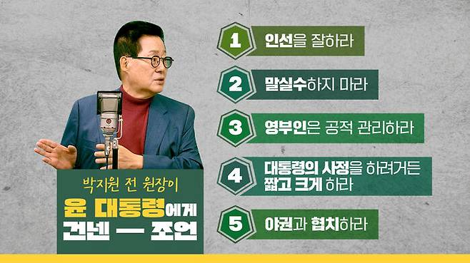 박지원 전 원장은 윤석열 대통령이 취임하기 전 5가지 사항을 대통령에게 조언했다고 합니다.