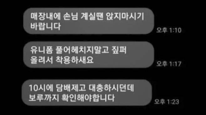"매장 내 손님이 계실 땐 앉지 마시기 바란다", "유니폼 지퍼 올려서 착용하세요", "담배 재고 보루까지 확인해야 한다" 등 알바생이 알겠다고 답장한 뒤에도 지시는 2~7분 간격으로 이어졌습니다.