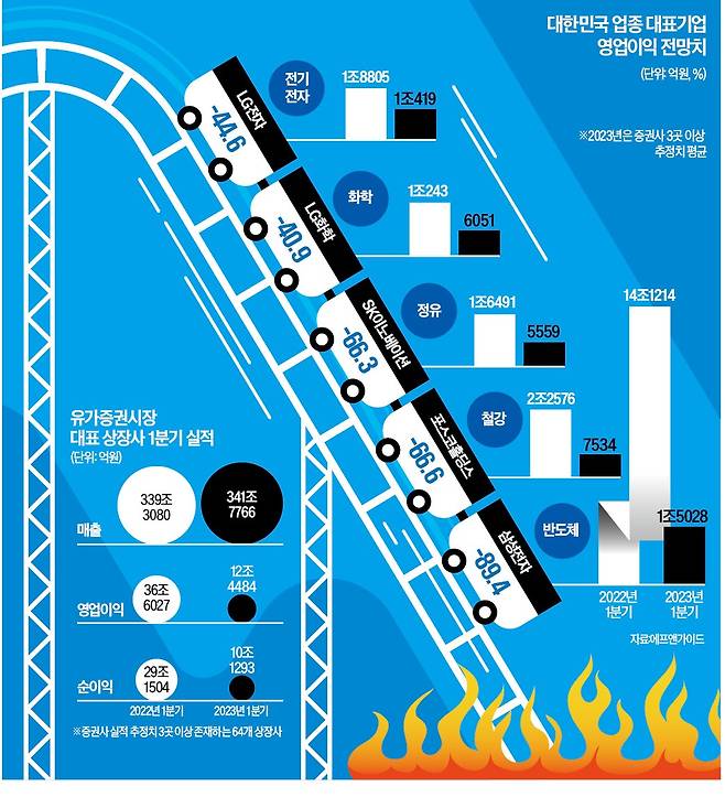 석유화학과 철강은 원가 상승과 수요 감소의 충격을 동시에 받고 있다. 포스코홀딩스는 1분기 영업이익이 7534억원으로 66.6% 감소할 것으로 예상된다. 같은 기간 현대제철(영업이익 감소율 -63.8%), 금호석유화학(-76.3%), LG화학(-40.9%) 등도 영업이익이 큰 폭으로 감소할 것으로 전망된다.