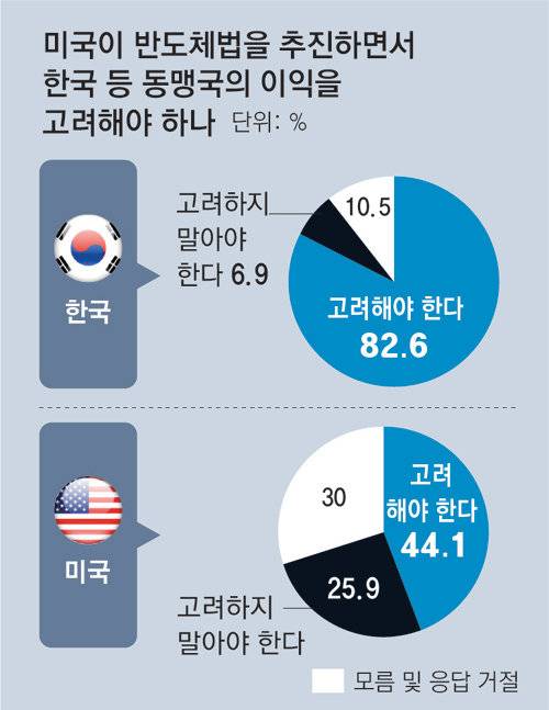 동아일보와 국가보훈처가 한국갤럽에 의뢰해 한미 국민들을 대상으로 실시한 여론조사에 따르면 ‘미국이 반도체법을 추진하는 과정에서 한국 등 동맹국의 이익을 고려해야 한다’고 생각하는 미국인은 44.1%였다. ‘고려하지 말아야 한다’(25.9%)는 비율보다 높았다.