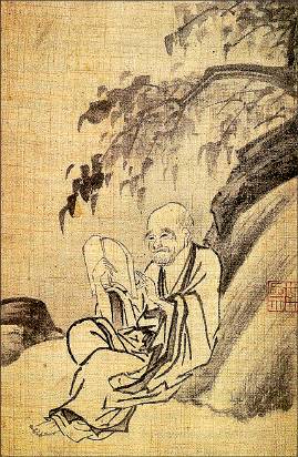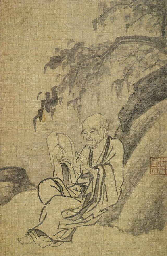 그림에서 단연 눈길을 끄는 부분은 얼굴 표정이다. 척척 내려 그은 옷자락에 비해 공들인 흔적이 또렷하다. 수척한 얼굴에 수염은 단출한데, 유난히 눈썹이 길게 늘어졌다. 검은 먹으로 그려낸 백미(白眉) 같다. 한일자로 앙다문 입단속은 야무지다. 책 속의 글자 하나하나에 몰두하는 스님의 심중과 퍽 어울린다. 내려다보는 시선은 또 어떤가. 책에 박힐 듯 끈질기다. 인물 묘사에 이골이 난 공재의 기량이 디테일에서 여실히 드러난다. 스님의 손시늉은 요즘 눈으로도 재미있다. 마치 태블릿 PC 화면을 터치해가며 열독하는 것처럼 보인다.