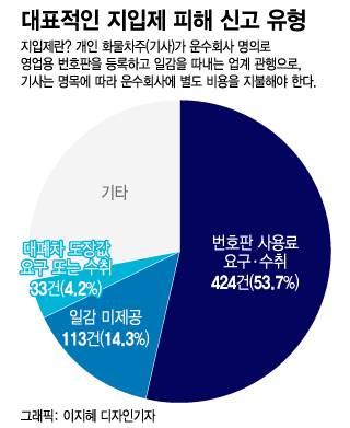 대표적인 피해신고 사례는 운송사업자가 번호판 사용료를 요구·수취한 경우가 424건(53.7%)으로 가장 많았다. 이 외에 지입료를 받고 일감을 미제공한 경우는 113건(14.3%), 화물차량을 대폐차하는 과정에서 동의비용으로 '도장값'을 수취하는 경우가 33건(4.2%) 등이었다. '번호판 쪼개기' 등을 통한 운송사의 불법증차 신고도 여러 건 접수됐다. 이를 검토한 결과 불법증차 의심차량이 76대 확인돼 추가 조사를 실시할 예정이다.