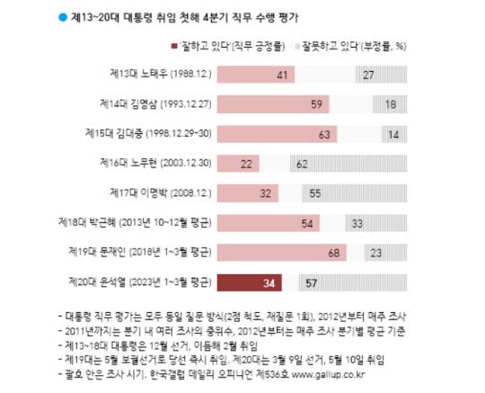 취임 첫해 4분기 직무 수행 평가를 취합한 결과, 윤 대통령은 올해 1∼3월 긍정 34%, 부정 57%로 조사됐다. 민주화 이후 역대 대통령과 비교하면 긍정은 노무현 전 대통령(22%), 이명박 전 대통령(32%) 다음으로 낮다. 부정 평가는 노무현 전 대통령(62%)을 제외하고 최고치다.