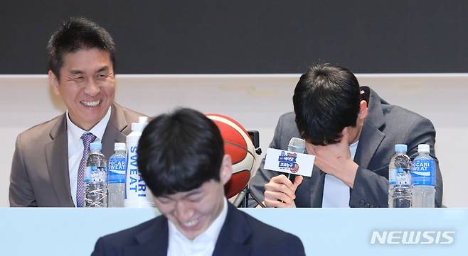[서울=뉴시스] 권창회 기자 = KGC 변준형이 31일 오전 서울 송파구 올림픽파크텔에서 열린 2022-2023시즌 프로농구 플레이오프 미디어데이에서 인사말을 하며 부끄러워하고 있다. 2023.03.31. kch0523@newsis.com