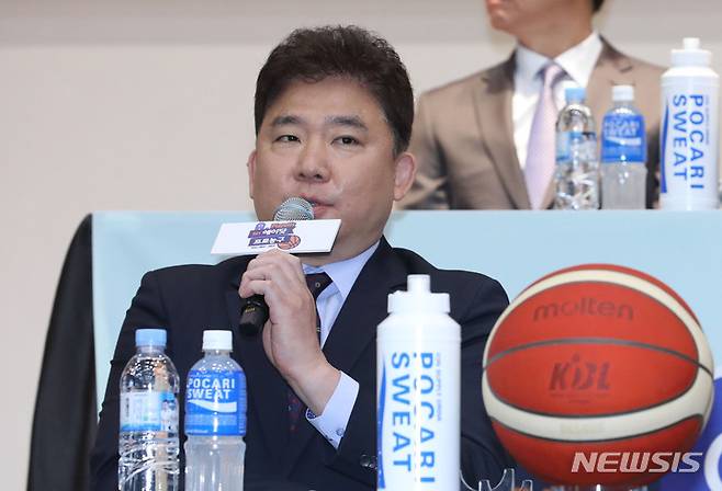 [서울=뉴시스] 권창회 기자 = 김승기 캐롯 감독이 31일 오전 서울 송파구 올림픽파크텔에서 열린 2022-2023시즌 프로농구 플레이오프 미디어데이에서 출사표를 밝히고 있다. 2023.03.31. kch0523@newsis.com