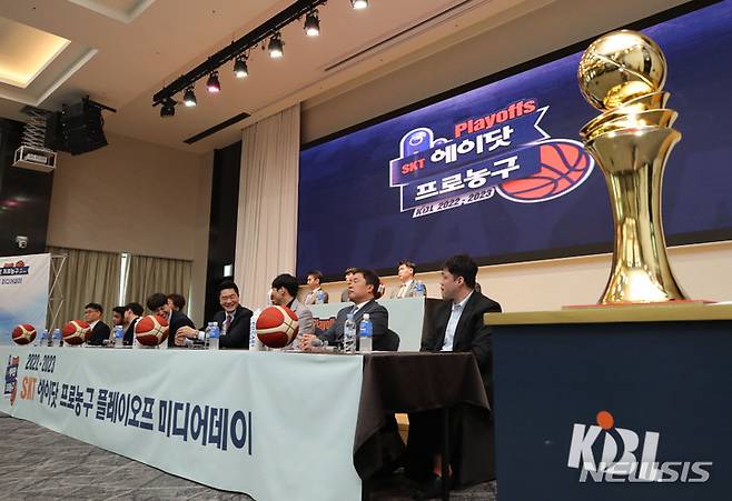 [서울=뉴시스] 권창회 기자 = 31일 오전 서울 송파구 올림픽파크텔에서 2022-2023시즌 프로농구 플레이오프 미디어데이가 열리고 있다. 2023.03.31. kch0523@newsis.com