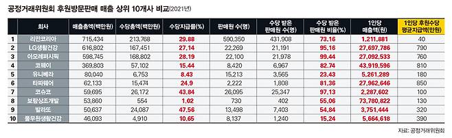 반면, 리만코리아 판매원들이 직접 영업을 뛰며 소비자에게 제품을 팔아 창출한 수익을 의미하는 '1인당 평균 매출액'은 업계 최하위인 것으로 나타난다. LG생활건강과 아모레퍼시픽의 2021년 1인당 평균 매출액은 각각 2769만원, 2709만원이다. 하지만 리만코리아 판매원들의 1인당 평균 매출액은 121만원으로 후원방문판매 기업 상위 20곳 중 가장 낮다. 이는 리만코리아 판매원들이 상품을 소비자에게 제대로 못 팔고 있거나 혹은 영업하지 않은 판매원이 많기 때문이라고 해석할 수 있다.