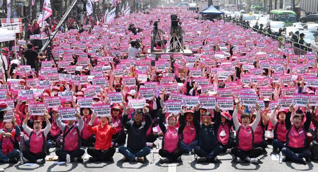31일 서울 중구 태평로에서 총파업에 동참한 전국학교비정규직연대회 조합원들이 임금 차별 해소 등을 요구하며 집회를 하고 있다. 오승현 기자 2023.03.31