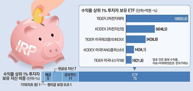 이들 고수익 투자자들은 대부분 자산을 ETF에 투자하고 있다는 점이 눈길을 끈다. 상위 1% 고객의 ETF 투자 비중은 75%에 이르는 것으로 나타났다. 일반 공모 펀드 투자 비중은 11%에 머물렀다. 예금과 현금성 자산 비중도 12%에 이르러 유동성을 충분히 확보해 놓고 있는 모습이었다. 뿐만 아니라 리츠(부동산투자회사)·원리금보장 주가연계파생결합사채(ELB), 상장지수증권(ETN) 등 다양한 자산에 분산 투자하고 있었다.