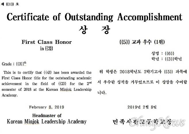 민사고가 정군에게 준 상장에는 "교과우수(1등)"란 문구와 함께 "위 학생은 2018학년도 2학기고사 서양OO개론 과목에서 우수한 성적을 거두었으므로 이 상장을 수여합니다. 민족사관고등학교장"이란 글귀가 쓰여 있었다.