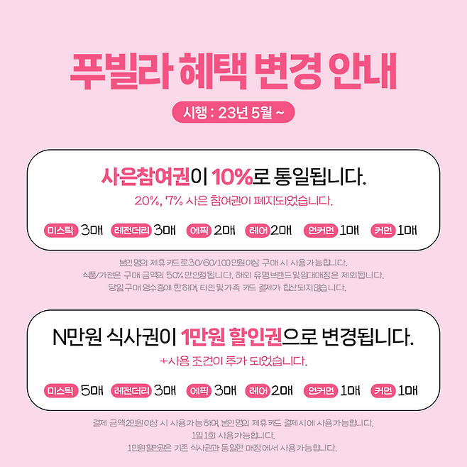 푸빌라는 미스틱, 레전더리 등 총 6개의 등급이 차등된 혜택을 받을 수 있었는데요. 이번 변경안을 통해 금액 제한만 있던 기존과 다르게 본인 명의 신세계 제휴카드로 30/60/100만원 이상 구매시 사용 가능한 사은 참여권을 전 등급 10%로 통일했습니다. 등급별로 상이했던 식사권 제공은 사용 조건을 추가하여 1만원 할인권으로 변경했구요. 등급별로 지급 갯수는 다르지만요.