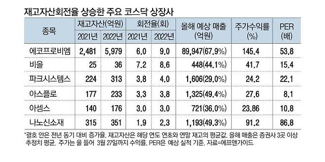 그 유명한 에코프로비엠이 포함됐다. 이 회사의 평균 재고는 2021년 2481억원에서 2022년 5979억원으로 141% 증가한다. 그러나 같은 기간 매출은 261%나 급증해 회전율이 같은 기간 6회에서 9회로 뛰었다. 에코프로비엠이 만드는 2차전지 양극재가 내놓는 족족 잘 팔린다고 회계장부에 써 있는 셈이다. 양극재는 전기차 배터리 핵심 소재 중 하나다.