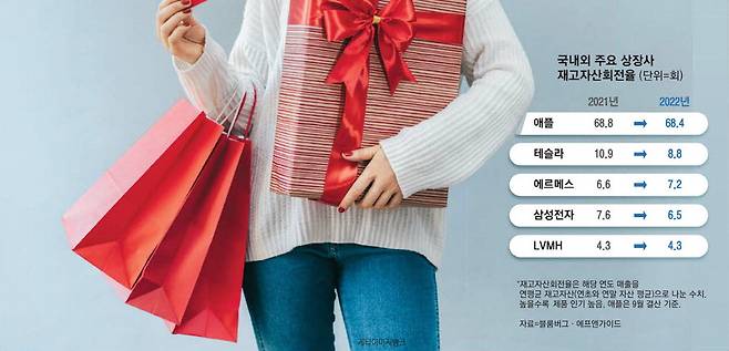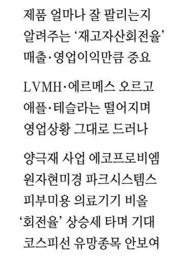 유럽과 달리 미국 대형주도 고전 중이다. 아이폰을 판매하는 애플은 재고자산회전율이 떨어졌다. 2021년(9월 결산) 68.8회에서 2022년 68.4회로 하락했다. 아르노 회장과 세계 최고 부자 1, 2위를 다투는 일론 머스크 최고경영자(CEO)의 테슬라마저도 침체 여파를 피해가지 못했다. 유럽 명품기업이 가방 가격을 올릴 때 테슬라는 매출 방어를 위해 전기차 가격을 인하했다. 작년 한때 중국 내 재고가 쌓여 판매관리비가 증가하기도 했다. 이에 따라 회전율은 2021년 10.9회에서 작년 8.8회로 하락한다.