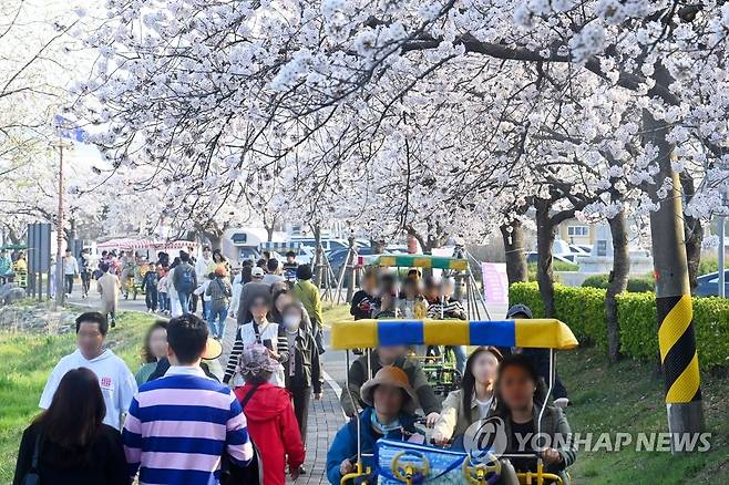 (강릉=연합뉴스) 유형재 기자 = 31일 벚꽃축제가 개막한 강원 강릉시 경포대 일원에 벚꽃이 만개해 관광객과 시민 발걸음을 모으고 있다. 2023.3.31