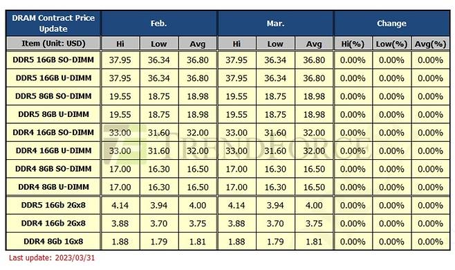 트렌드포스는 "공급업체는 여전히 상당한 재고 압박을 받고 있다"면서 "PC용 D램의 2분기 하락률이 15~20%로 더 확대될 수 있다"고 예고했다. 특히 D램 업계 재고 상황과 관련해 "아직 가시적인 생산 감축을 시작하지 않은 일부 공급업체의 경우 재고가 계속 쌓이고 있다"면서 "(재고를 소진하려면) 가격을 대폭 인하하는 것 외에는 다른 옵션이 없다"고 덧붙였다.