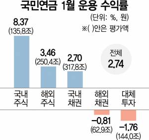 국민연금 기금운용본부가 올해 1월 2.74%의 운용수익률을 기록했다고 31일 공시했다.