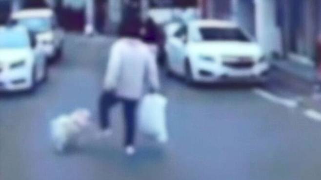 강아지와 길을 가던 한 여성, 갑자기 강아지 얼굴을 발로 번갈아 툭툭 차더니, 손에 든 짐을 내려놓고 과도를 꺼내 강아지를 때리기 시작합니다.