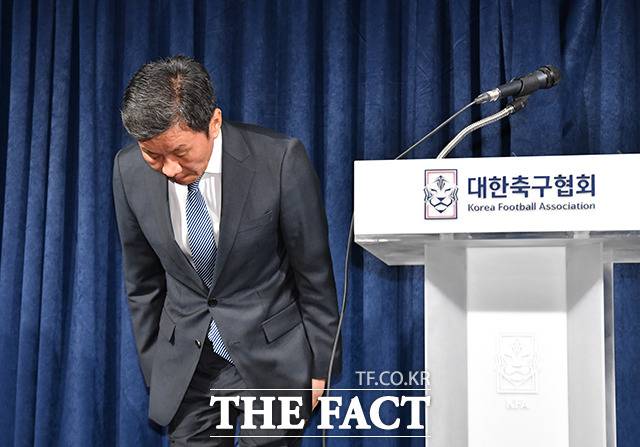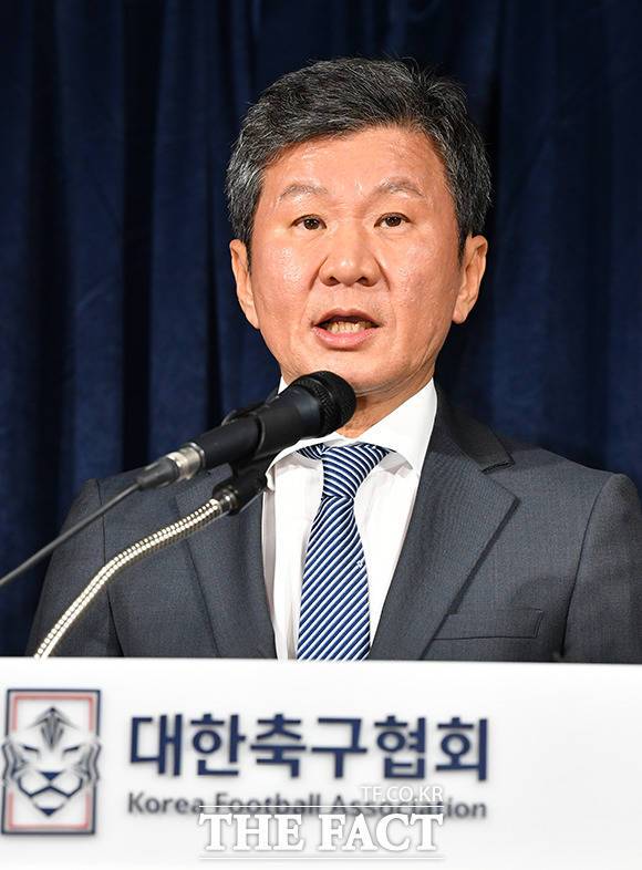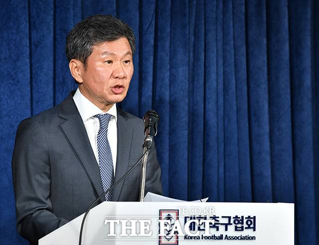 [더팩트ㅣ박헌우 기자] 정몽규 대한축구협회 회장이 31일 오후 서울 종로구 대한축구협회 축구회관에서 열린 임시이사회를 마치고 입장문을 발표하고 있다.