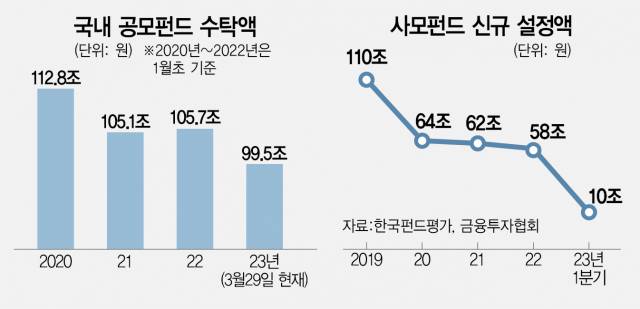 31일 한국펀드평가사에 따르면 2월 6일 머니마켓펀드(MMF)·ETF를 제외한 국내 공모펀드 수탁액(설정액 기준)은 99조 8892억 원을 기록해 2007년 6월 이후 처음으로 100조 원 미만을 기록했다. 공모펀드 설정액은 이후에도 4000억 원 이상 더 줄어 29일에는 99조4846억 원으로 주저앉았다.