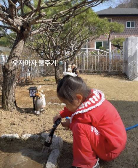 31일 서효림은 "오자마자 물 주기"라며 마당의 한 구석에서 호스까지 직접 가져와 물을 주는 딸을 따뜻하게 바라봤다.