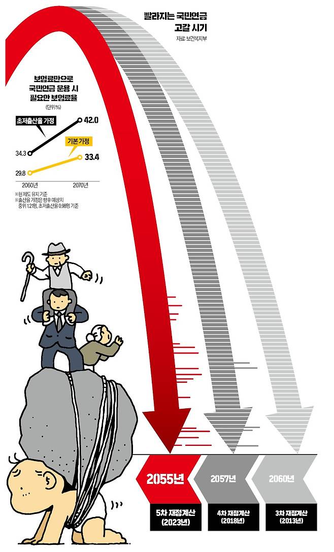 국민연금을 개혁하지 않으면 2055년 기금이 완전 고갈되고, 이후 보험료만으로 연금을 지급(부과 방식)하려면 가입자 소득의 최대 42%를 보험료로 걷어야 한다는 정부의 공식 전망이 나왔다.