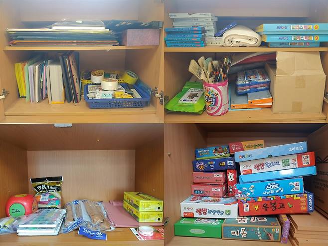 그 결과 내가 교사로 일하는 우리 반 수납장은 작은 문방구에 가까운 모습이 된다. 주인은 없다. 굳이 분류하면 학습 준비물 예산으로 산 물건이 80%이므로, 공공재라고도 할 수 있다. 학습준비물 예산이 부족하면 학급운영비나 사비로 채워 넣는다. 어쨌든 담임교사인 내가 관리자이고 학생이 손님이다.