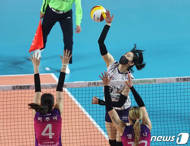 (인천=뉴스1) 구윤성 기자 = 31일 오후 인천 부평구 삼산월드체육관에서 열린 여자프로배구 2022-2023 V리그 챔피언 결정전 흥국생명과 한국도로공사 2차전 경기에서 도로공사 박정아가 스파이크를 시도하고 있다. 2023.3.31/뉴스1