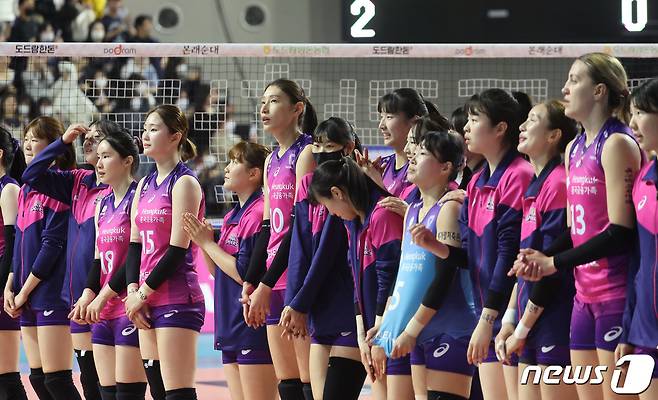 (인천=뉴스1) 구윤성 기자 = 31일 오후 인천 부평구 삼산월드체육관에서 열린 여자프로배구 2022-2023 V리그 챔피언 결정전 흥국생명과 한국도로공사 2차전 경기에서 김연경을 비롯한 흥국생명 선수들이 도로공사에 세트스코어 3대0으로 승리한 뒤 인사하고 있다. 2023.3.31/뉴스1